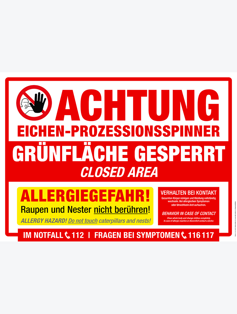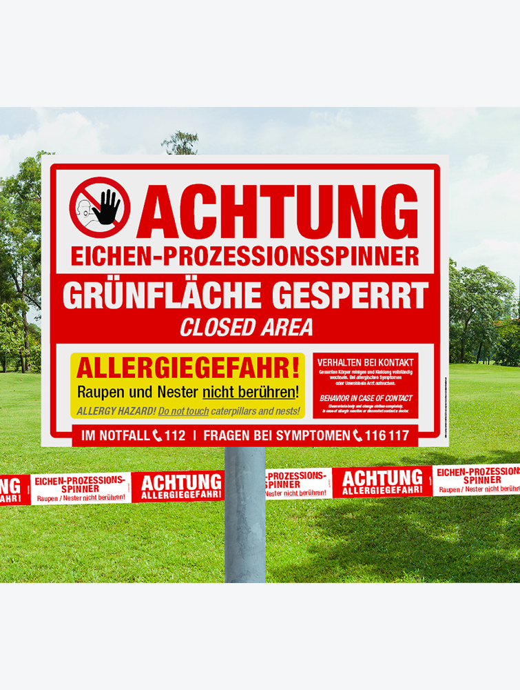 Hinweisschild zur Warnung vor Eichenprozessionsspinner. Hinweis auf gesperrte Grünfläche und Allergiegefahren. Eignet sich hervorragend um Waldwege und Grünflächen abzusperren.