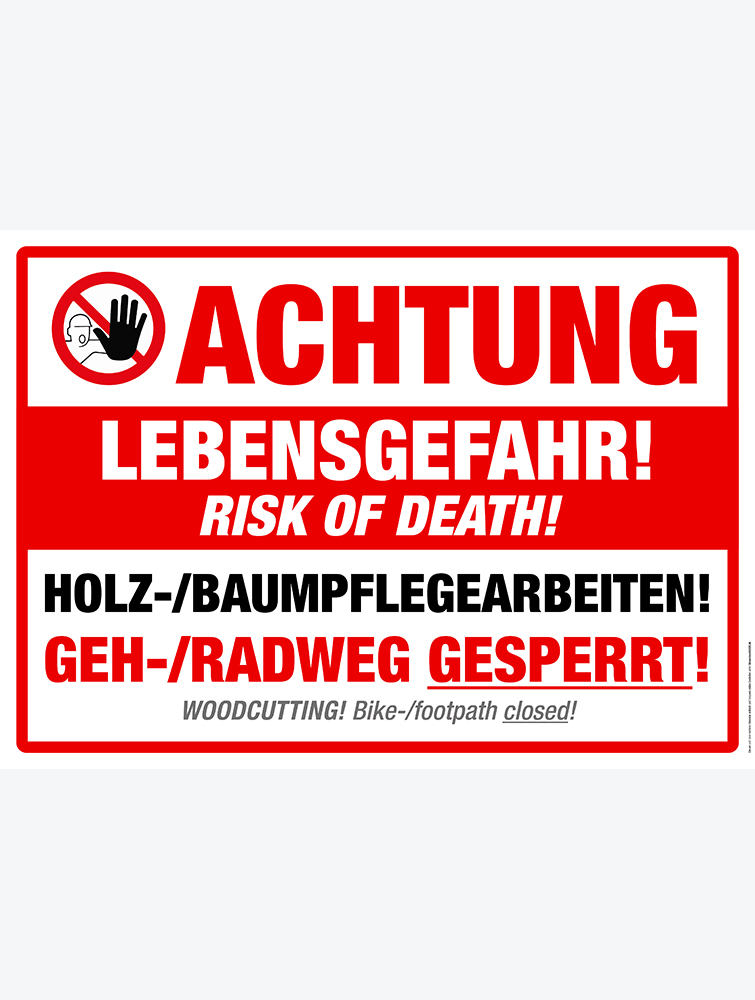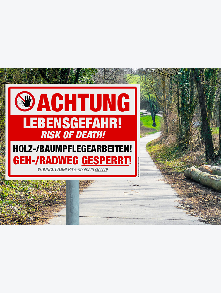 Aufschrift: Achtung Lebensgefahr. Holz/Baumpflegearbeiten. Geh/Radweg gesperrt.