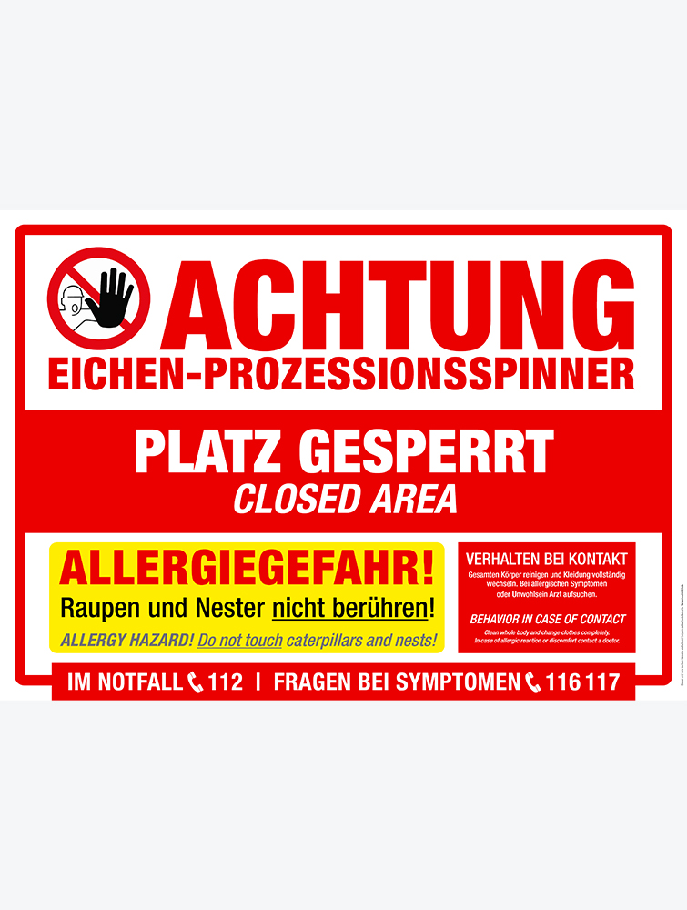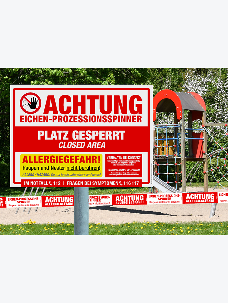 Hinweisschild zur Warnung vor Eichenprozessionsspinner. Eignet sich ideal, um Spielplätze, Flächen oder Plätze zu sperren.