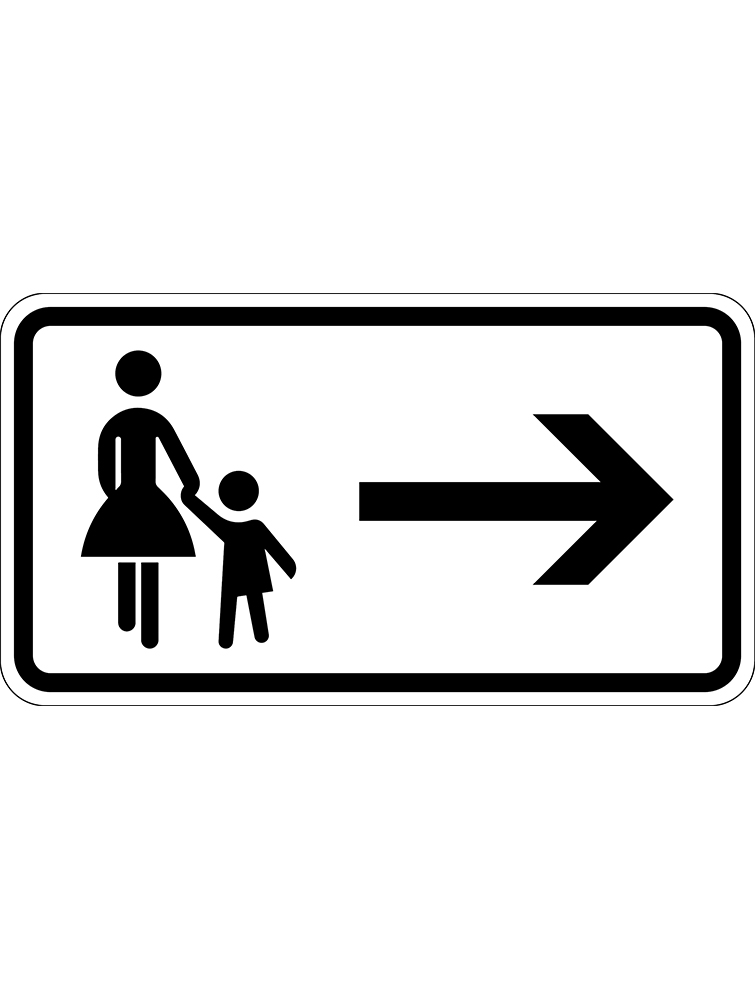 Zusatzschild zum Anbringen unter einem Hinweis für den Fußgängerbereich. Fußgängersymbol mit Pfeil nach Links oder Rechts. Straßenzulassung, Reflexionsklasse RA 1.